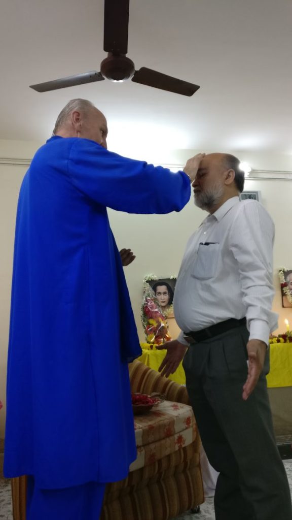 - NayaSwami Jayaji blessing a Kriyaban during the ceremony.
